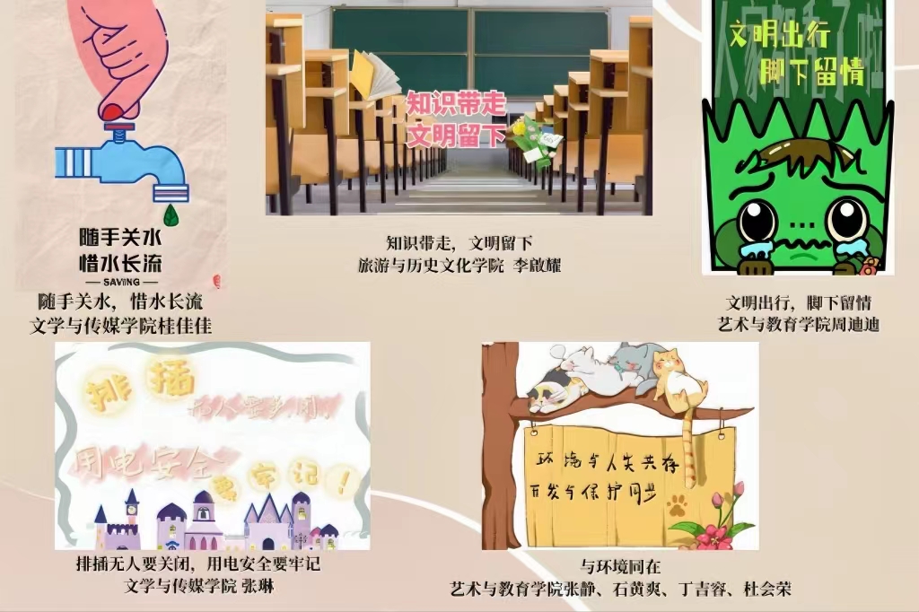 活动期间,同学们积极参与,针对宿舍生活区、教学公共区、食堂就餐区、景观漫步区、娱乐休闲区等校园区,围绕爱护公物、友好相处、节约资源等主题,亲手设计制作内容丰富,形式多样的文明标语。设计标语朗朗上口,具有较强的感染力、号召力,经过线上投票和线下展示评比,产生六组优秀作品。