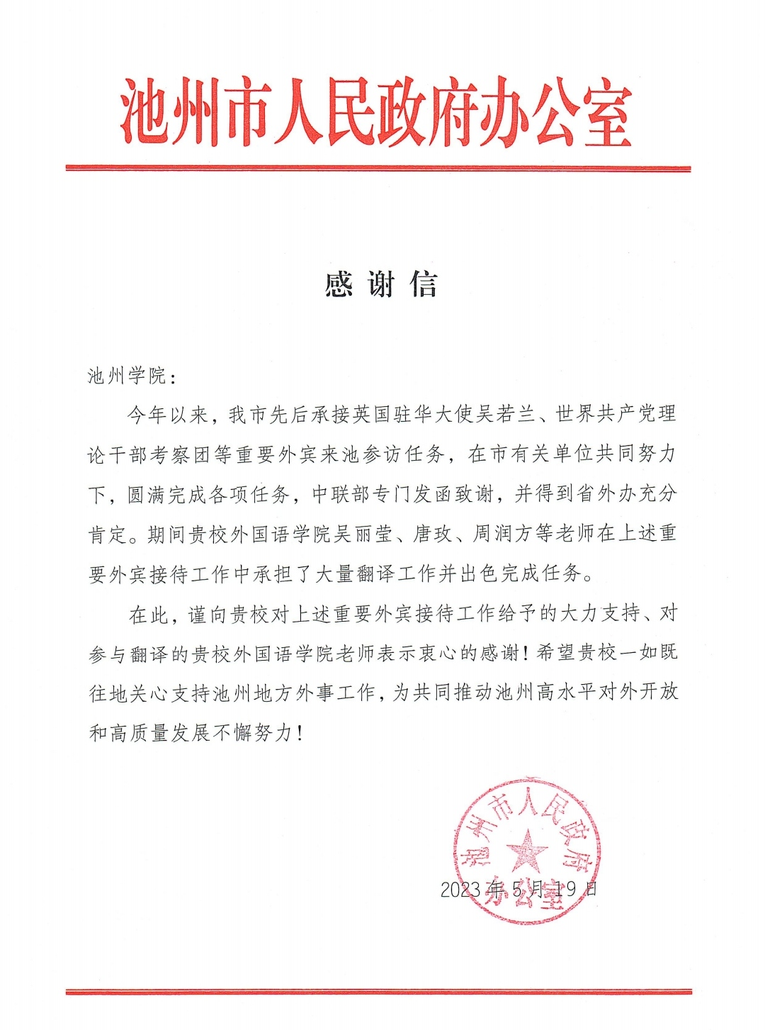 5月19日,池州市人民政府办公室向永利官网发来感谢信,对永利官网外国语学院在外事接待工作上的大力支持表示诚挚感谢。