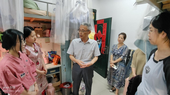 会后,学院领导带领教研室主任和毕业班辅导员走访了毕业生宿舍。在走访的过程中,党委副书记周建国和副院长曾晓红与同学们进行了广泛的交流,仔细询问了同学们目前的毕业手续办理情况、就业情况和毕业去向等等。同时叮嘱同学们在毕业前夕要保持宿舍干净整洁,提高安全防范意识,确保每一位同学都能安全文明离校。在与院领导交谈过程中,毕业班学生纷纷表示一定遵守好校纪校规,积极配合学校宿舍文明建设工作,站好这最后一班岗,并感谢学校、学院一直以来对毕业生同学的关心和爱护。