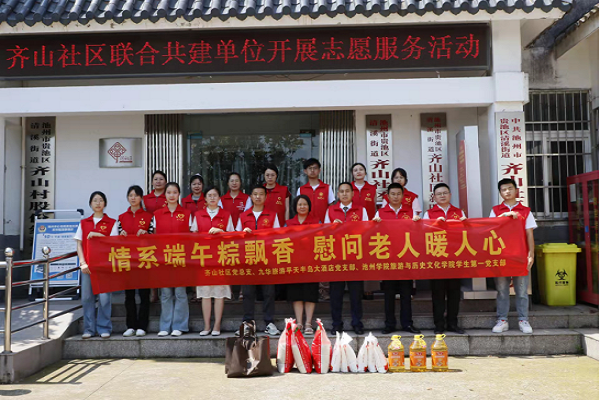 学生一支部与平天半岛大酒店党支部、齐山社区党总支联合开展“情系端午粽飘香,慰问老人暖人心”主题党日活动,师生党员们带上自亲包制的端午粽子和慰问品前往齐山社区特困老年人家中,询问他们的身体状况和生活需求,为他们卫生打扫、整理内务,共同度过了一段温馨而有意义的时光。