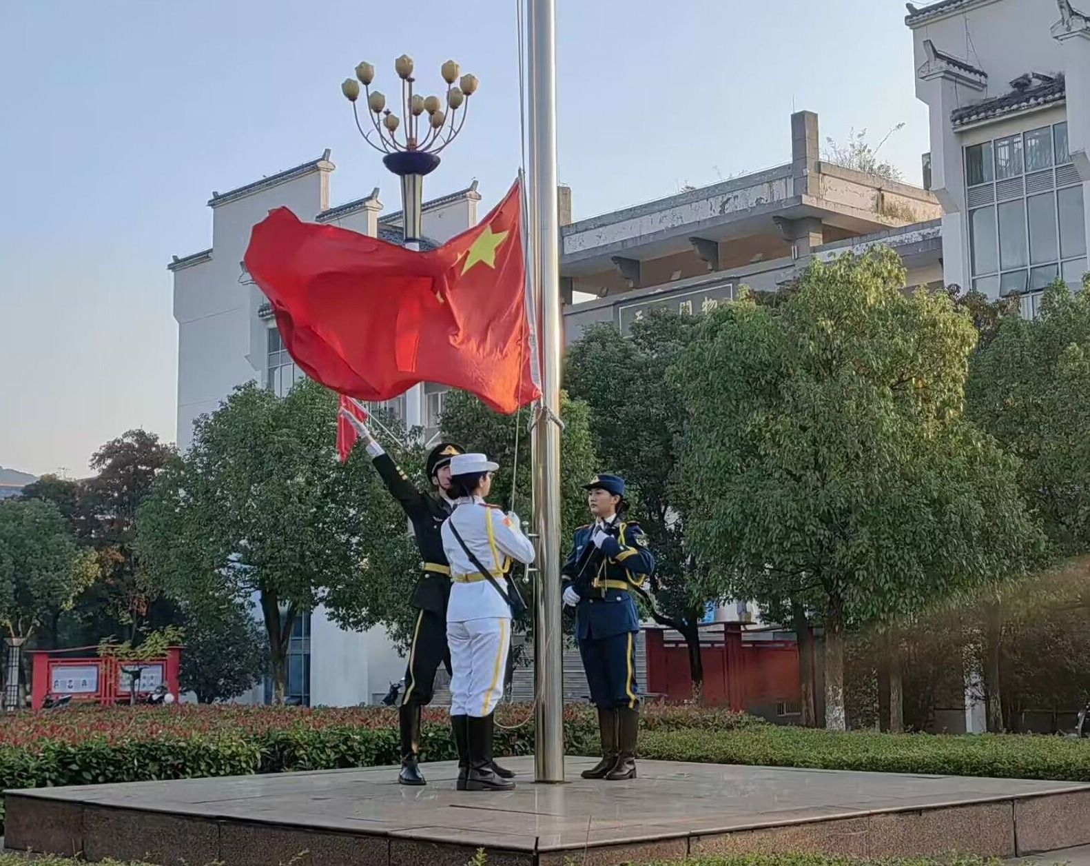 仪式第一项,升国旗,奏国歌,行注目礼。庄严的《义勇军进行曲》响起,在全体同学的注目礼中,身姿挺拔的国旗护卫队队员迈着矫健的步伐护送鲜艳的五星红旗进场,五星红旗伴随着微风冉冉升起。